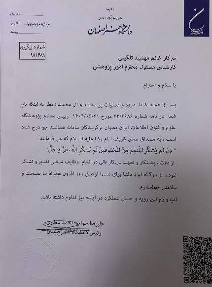 همچنین در جلسه هیات رییسه روز یکشنبه 13 مهر‌ماه 1404 رییس دانشگاه دکتر علیرضا خواجه احمد عطاری از دقت، پشتکار و تعهد ایشان در انجام وظایف شغلی با اهدا لوح تقدیر، قدردانی نمود.